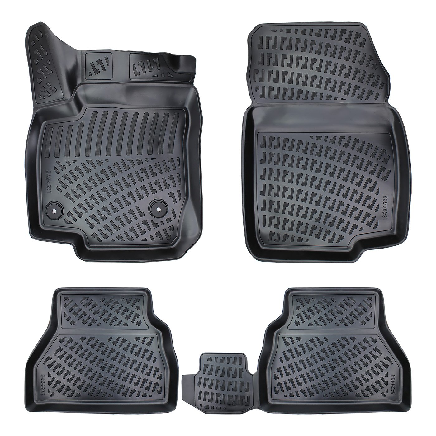 - Vollständige Bodenabdeckung: Ein Set aus vier Gummifußmatten sorgt für eine vollständige Abdeckung des Fahrzeugbodens. Es umfasst die Bereiche unter den Fahrer- und Beifahrersitzen mit Fußstütze sowie die hinteren Sitzreihen mit Tunnelabdeckung. Dies bietet maximalen Schutz und verleiht dem Innenraum ein einheitliches Erscheinungsbild.