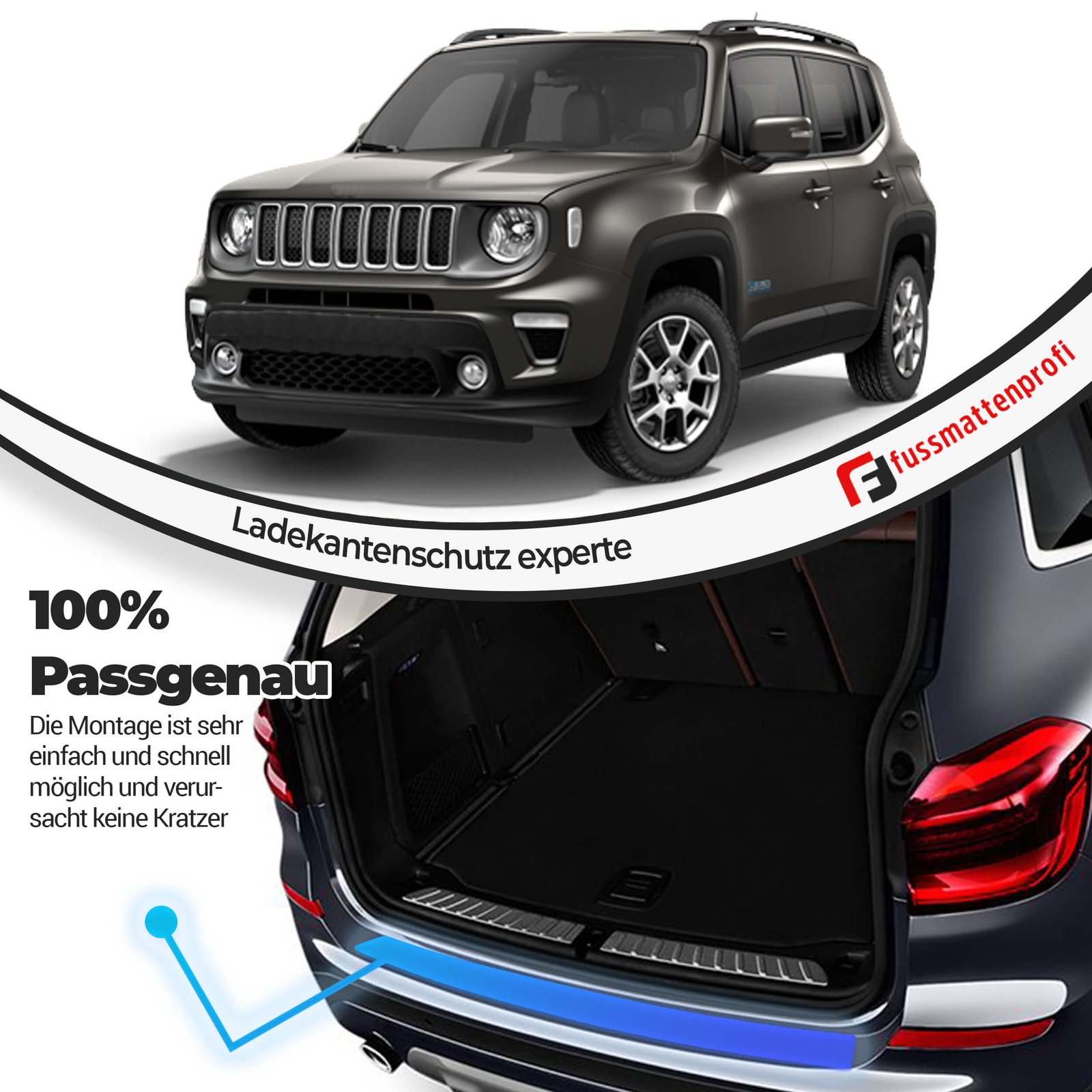 Bei uns können Sie einen professionellen Jeep Renegade Ladekantenschutz bestellen Sie erhalten keine Billigware aus China, sondern hochwertig reduzierte europäische Ware von Fussmattenpremium.ch :· Die Ladekante von Ihrem Jeep Renegade können Sie optimal vor Kratzern, Schrammen, Dellen oder anderen Schäden schützen. Bestimmt wissen Sie, wie stark beansprucht die Einladekante oder Ausladekante von Ihrem Jeep Renegade ist· Damit können Sie den Wiederverkaufswert zumindest erhalten, bzw. sogar steigern· Die Aufwertung von dem gesamten Exterieur Ihres Jeep Renegade können Sie dadurch gestalten Diese Vorteile bieten sich an:· Für die Montage ist kein Aufwand nötig, Sie erfolgt ohne Kratzer, schnell und einfach· Sie befestigen Ihre Jeep Renegade Ladekantenschutzfolie ganz einfach mithilfe des Klebebandes· Bohrer brauchen Sie dafür nicht, die Montageanleitung ist einfach zu lesen und umzusetzen· Bei der Entfernung entstehen keine Rückstände Lassen Sie Ihren Jeep Renegade optisch edel erscheinen· Durch die Ladekantenschutzfolie für den Jeep Renegade entsteht ein exklusiver Look, die Optik wirkt besonders edel. Dafür sorgt entweder der Chrom oder der ABS Kunststoff· Der Kofferraum erstrahlt dann ein einem ganz neuen Look· Die Jeep Renegade Ladekantenfolien sind besonders massiv und stabil Passt garantiert zu 100 %· Wir versprechen Ihnen, dass Sie eine 100 prozentige Passgenauigkeit für Ihren Jeep Renegade und der Ladekantenschutzfolie genießen. Für jedes Automodell kommt die Spezialtechnik mit Laserschnitt zum Einsatz· Die Parksensoren werden garantiert nicht gestört· Unsere Ladekantenschutzfolie für Ihren Jeep Renegade garantiert Ihnen einen dauerhaften Schutz und optimale Waschanlagentauglichkeit. Sie genießen die perfekte Widerstandsfähigkeit, sowie die optimale Festigkeit gegen Kratzer, Stöße oder Hiebe Eine umweltschonende Möglichkeit· Nutzen Sie dieses umweltschonende Produkt für Ihren Jeep Renegade, denn die Zusammensetzung ist nicht nur hochwertig, sondern auch noch sehr langlebig· Damit genießen Sie den perfekten Umweltschutz und können auch die optimale Recyclingfähigkeit des Produkts genießen· Kostspielige oder aufwändige Nachlackierungsarbeiten sind bei Ihrem Jeep Renegade dadurch nicht nötig, wenn Sie diesen wieder verkaufen wollen